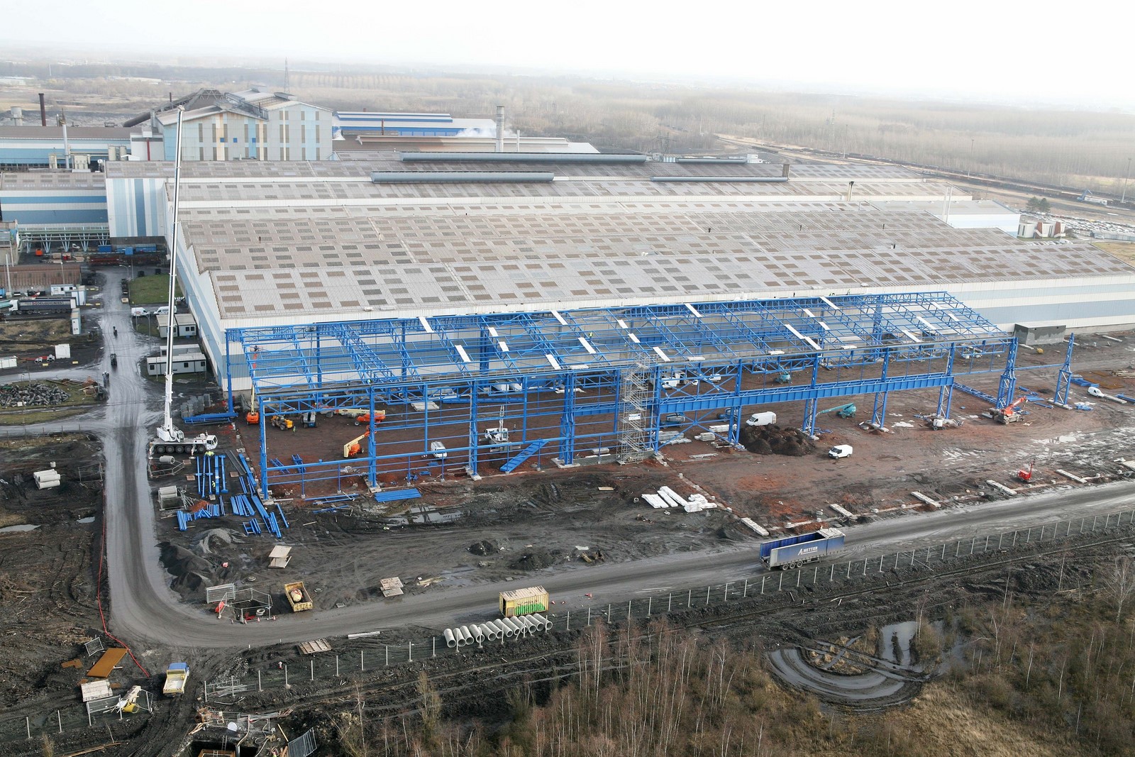 Double hall de 82m de largeur pour 270 et 198m de longueur. Hauteur : 22m Chemins de roulement sur les deux halls (une unique file de poteaux entre les halls)