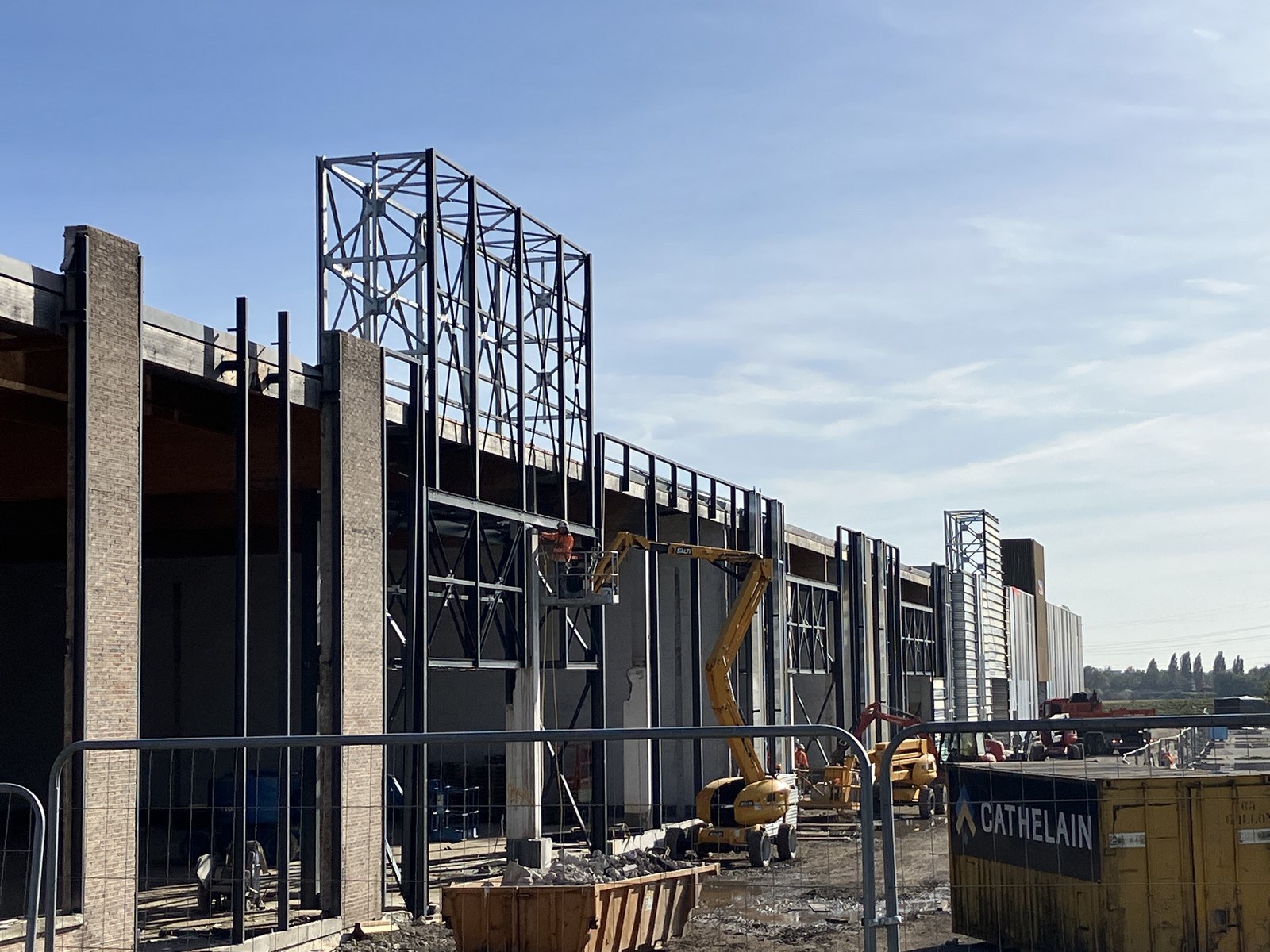 Rehabilitation de l'imprimerie DECOSTER en cellules commerciales sur le centre commercial AUCHAN ENGLOS. Réalisation de la charpente des façades de sas d'entrée y compris reprise des poutres du bâtiment existant pour suppression des poteaux de façades. Réalisation d'une charpente métallique d'extension pour bâtiment de stockage / reserves
