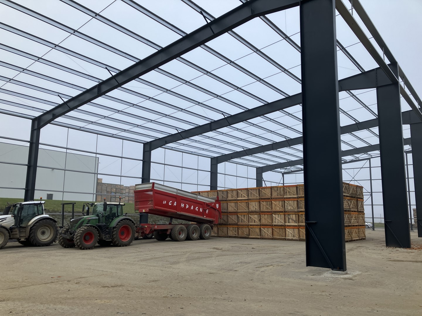 Construction d'une charpente métallique pour un auvent supportant des panneaux photovoltaïques. La structure est en PRS, ce qui permet de créer une grande porte. La hauteur libre sous poutre est de 10 mètres et la portée de l'auvent est de 24 mètres, sans poteau intermédiaire.