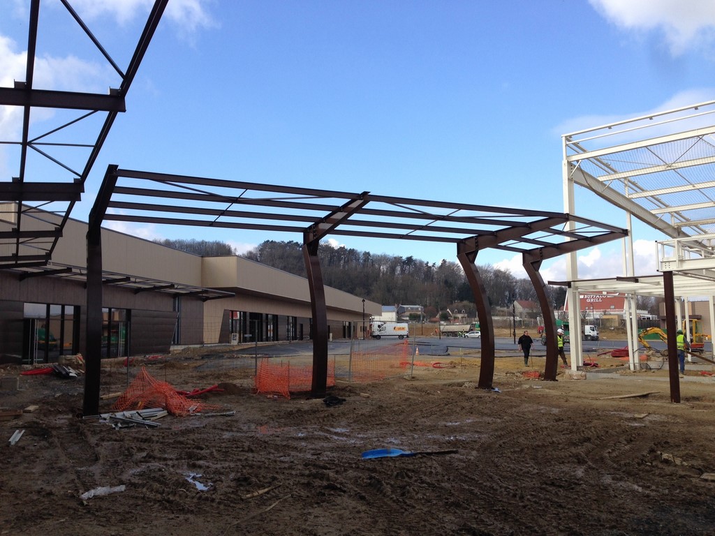 Construction d’un centre commercial composé de 21 cellules commerciales . Séparation par murs CF autostables Portiques PRS de 20 à 35m de portée