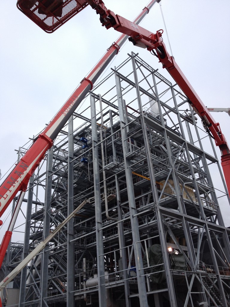 Construction d'une centrale cogénération sur la commune de Nesle | construction d’une chaudière BIOMASSE : Bâtiment Extraction : 44m00 en 8 travées de 5m50 / 30m00 de portée /Hauteur : 17m90 Chemins de roulement pour 3 ponts roulants capacités 35 Tonnes Bâtiment chaudière : 32m30 | 20m de portée | Hauteur : 35m70