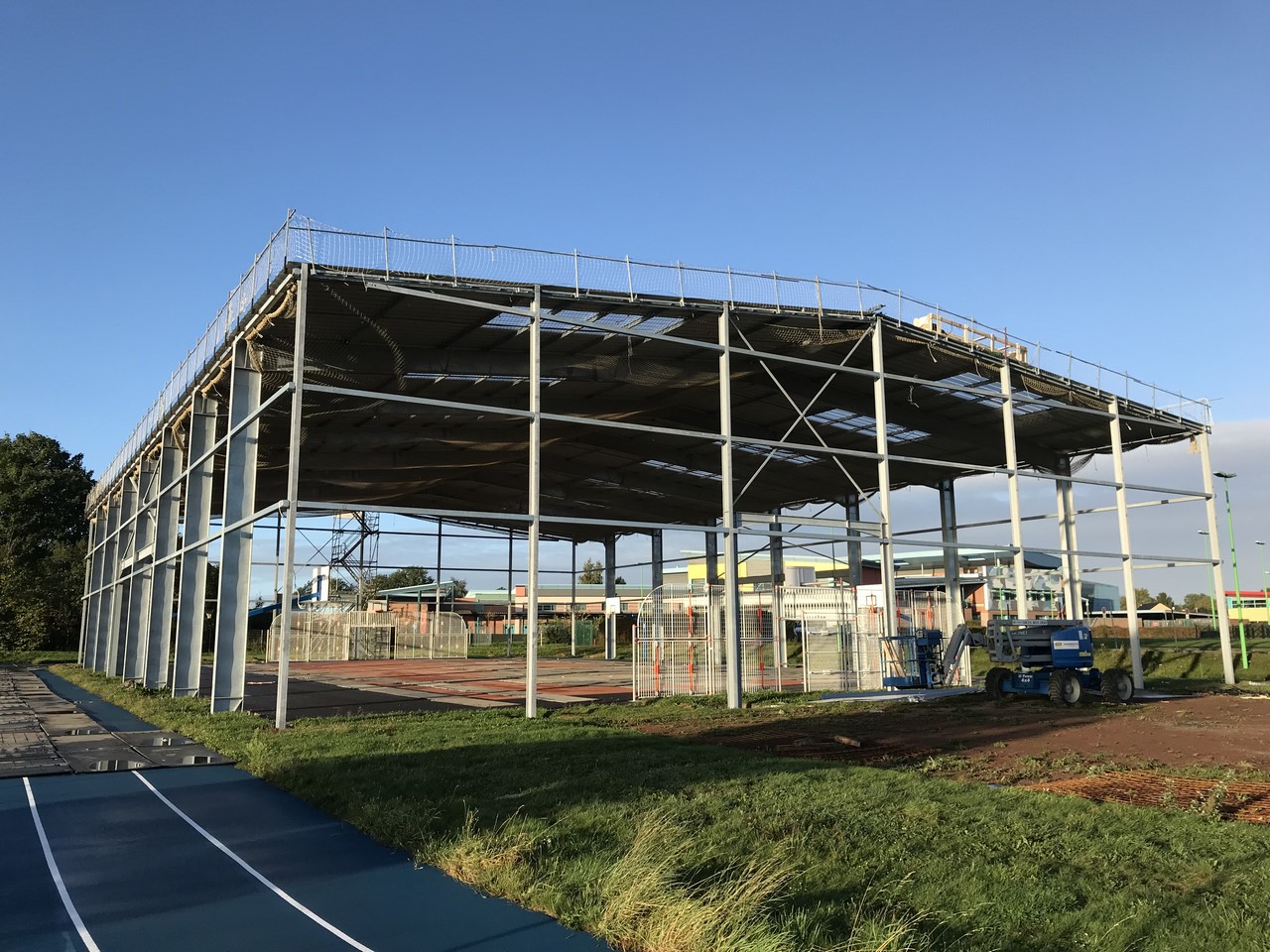 Couverture terrain sport existant, levage depuis l’extérieur (grue de location de 220t)
