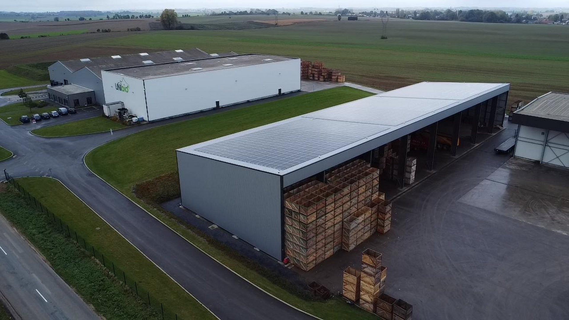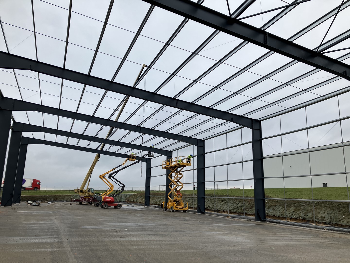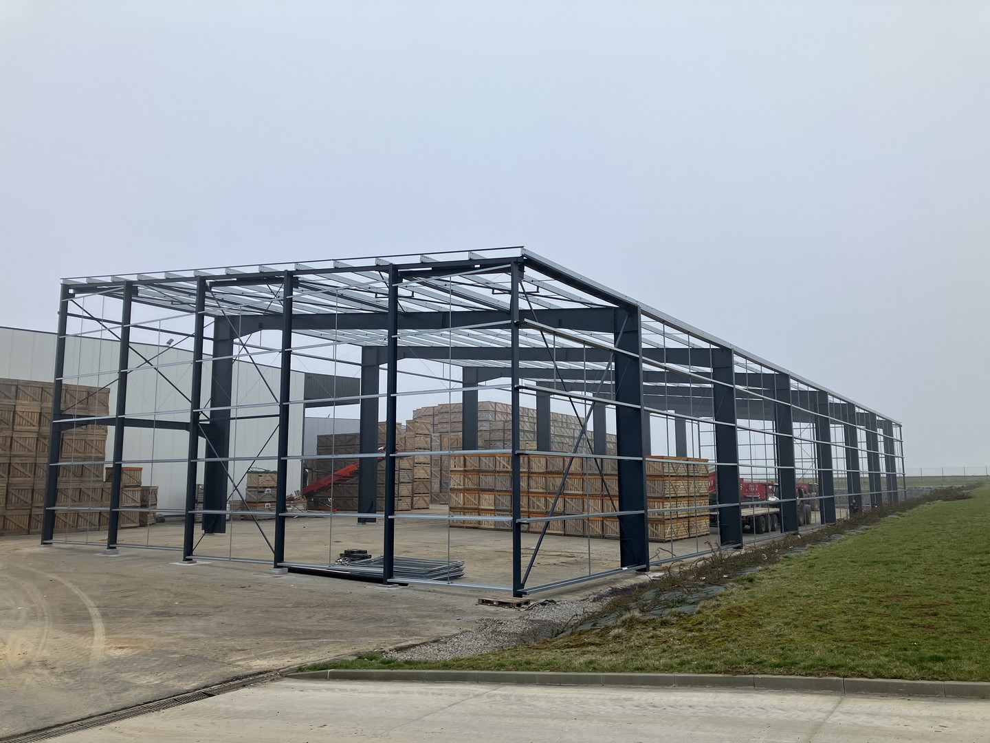 Construction d'une charpente métallique pour un auvent supportant des panneaux photovoltaïques. La structure est en PRS, ce qui permet de créer une grande porte. La hauteur libre sous poutre est de 10 mètres et la portée de l'auvent est de 24 mètres, sans poteau intermédiaire.