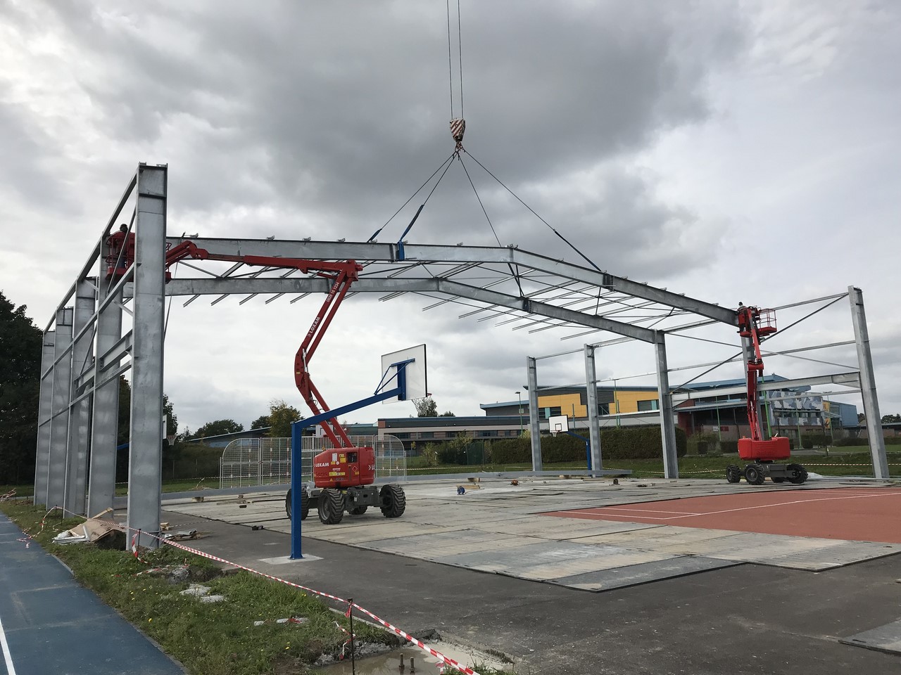 Couverture terrain sport existant, levage depuis l’extérieur (grue de location de 220t)
